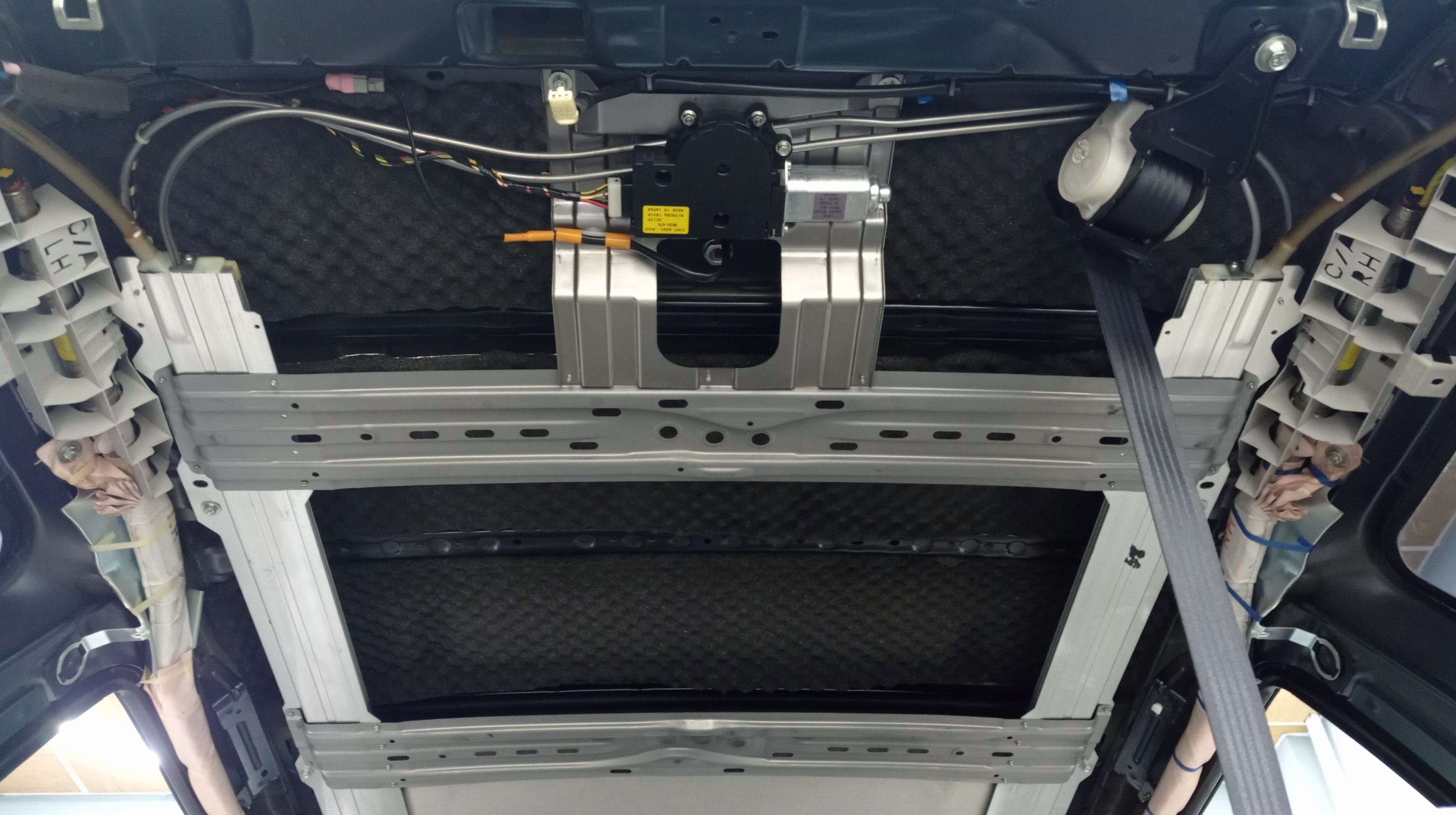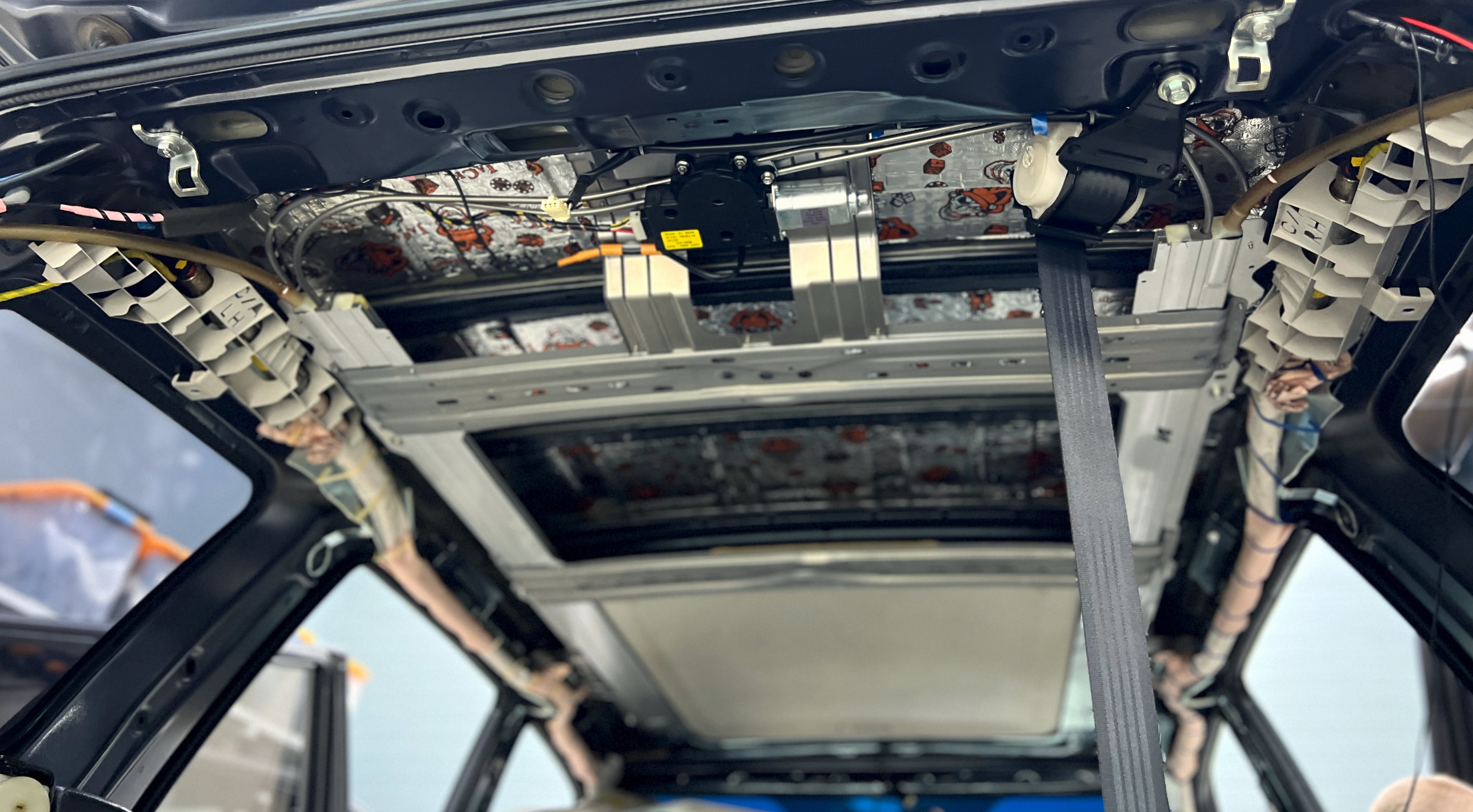 Виброизоляция крыши Субару Форестер Далее приступаем к разбору крыши, складываем на стеллаж. Удаляем штатную шумоизоляцию, обезжириваем всю поверхность крыши и приступаем к монтажу первого слоя. Достаем из специальной печки заранее подогретый Шумофф Jack и начинаем монтировать его на поверхность крыши, тщательно прикатывая каждый лист. Оклеиваем всю поверхность крыши между ребер жесткости. Этот слой избавит нас от шума дождя и града.