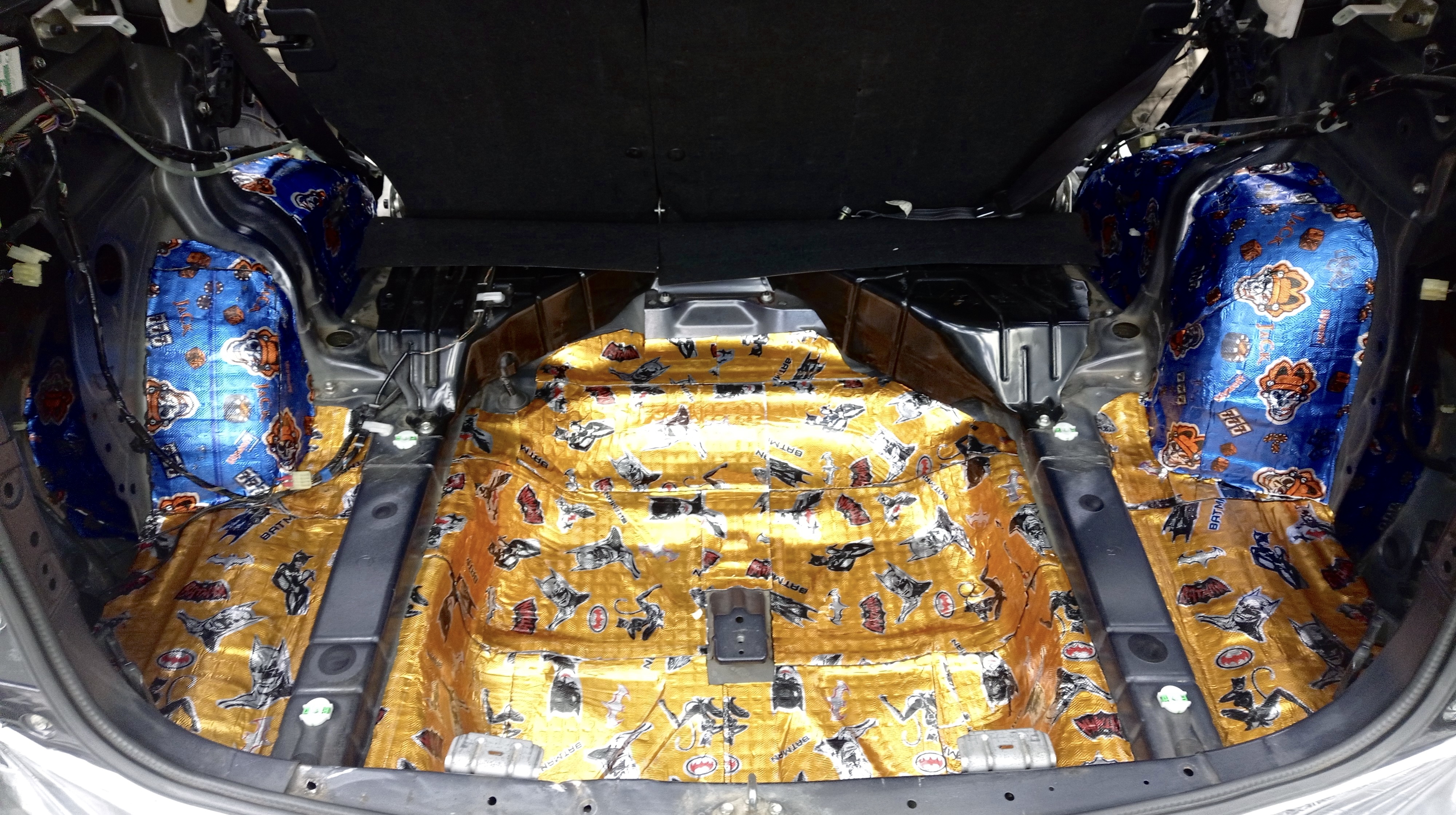Виброизоляция пола Субару Форестер Достаем из печки заранее подогретый Шумофф Super Jack, при толщине 3,6 мм является отличным вибродемпфером, оклеиваем им пол максимально под моторную перегородку до заднего сиденья. Под заднее сиденье клеим Шумофф Batman.