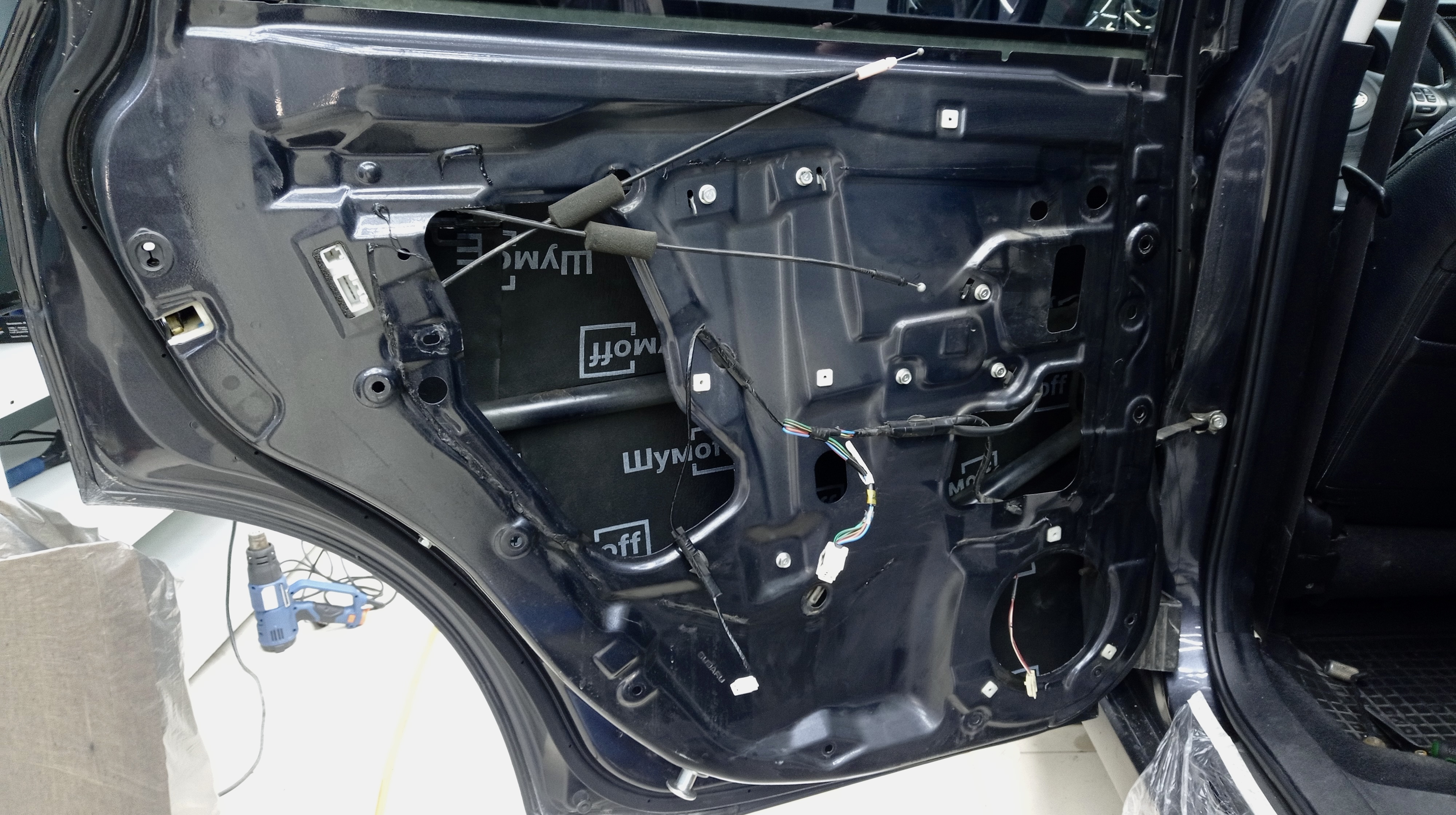 Разбор дверей Субару Форестер Снимаем дверную обшивку и убираем ее на специальный стеллаж для всего салона. Удаляем влагозащитную пленку с двери и приступаем к обезжириванию всех поверхностей двери перед нанесением материалов. На внутреннюю поверхность двери между ребер жесткости клеим современную виброизоляцию Шумофф Joker. Тщательно прикатываем каждый лист к поверхности, не оставляя пустот и пузырей